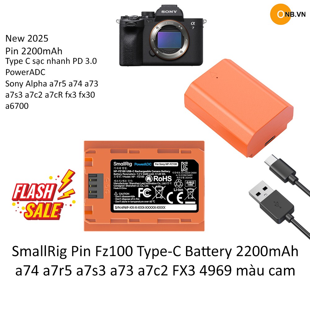 SmallRig Pin Fz100 Type-C Battery Orange 4969 màu cam mới 2025 - Mẫu pin máy ảnh Smallrig FZ100 mới nhất làm cho hệ máy Sony Alpha Full frame gồm a7r5 a74 a7s3 a7r4 a7r3 a7c a73 , fx3 fx30, ZV-E1 ...