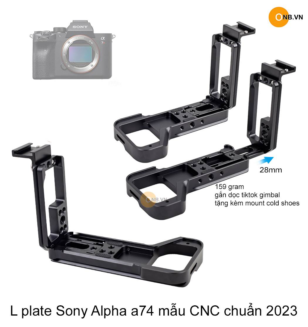 L Plate Sony Alpha a74 và a7r4 mẫu CNC chuẩn 2023 ! Thiết kế chất liệu kim loại hợp kim nhôm nhẹ 159 gram, tích hợp acra swiss gắn tripod kẹp dễ dàng, bên trái L Plate lỗ ốc 1/4 để gắn Gimbal quay dọc tikok