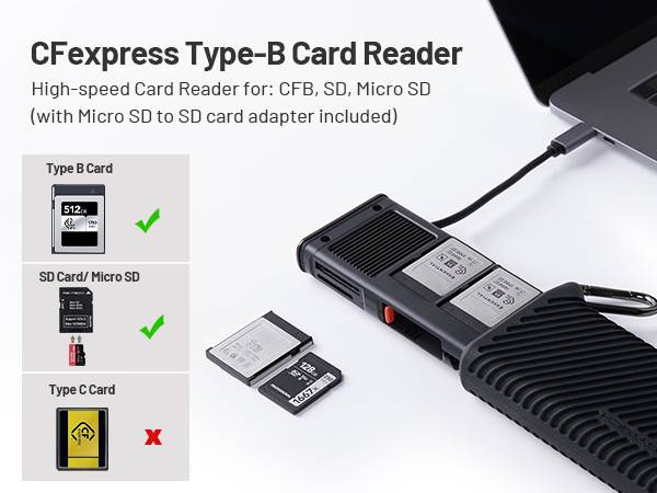 +Lưu ý đầu đọc chỉ đọc thẻ CFexpress Type B và thẻ SD còn thẻ micro SD hãng có tặng kèm adpater gắn vào SD