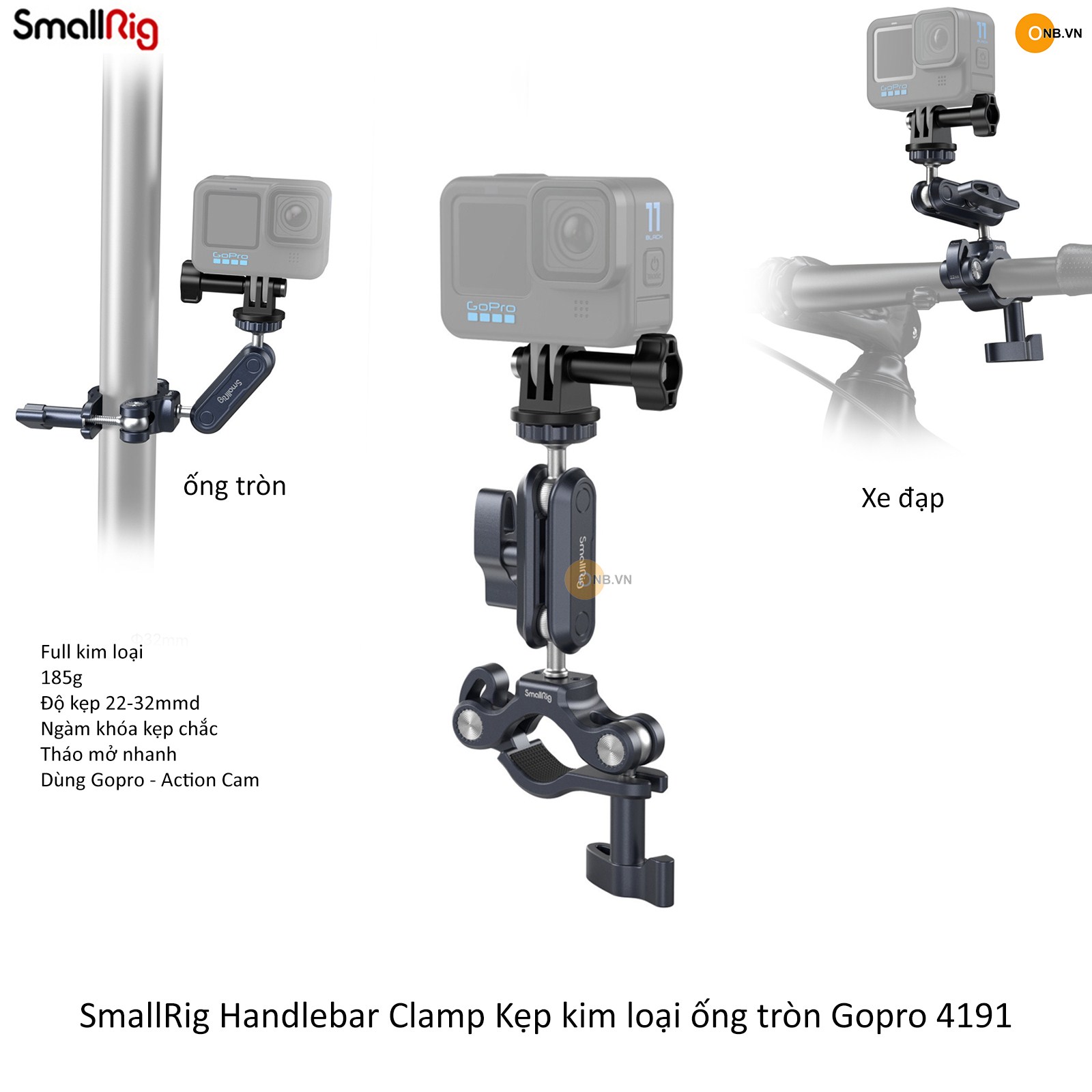 SmallRig Handlebar Clamp Kẹp kim loại ống tròn Gopro 4191 - Thiết kề full kim loại, khóa xoạy kẹp chắc chắn, xoay 360 dùng cho Gopro 13 12 11 10 9 8 7 6 5 - Osmo Action 4 3 2 1 - Pocket 1 - 2 và máy action khác dùng chốt xoay ốc 1/4.